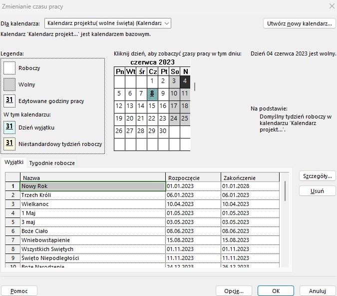 Możesz zmienić ustawienia kalendarza, aby dopasować go do projektu. Masz możliwość edytowania dni roboczych, godzin pracy oraz wprowadzania wyjątków. Dodawanie świąt, urlopów i przerw technologicznych sprawia, że harmonogram staje się bardziej realistyczny.