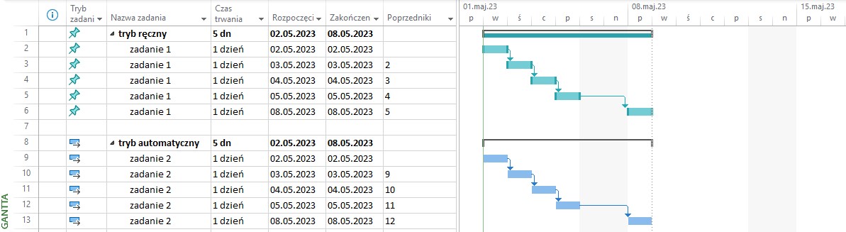 - W trybie ręcznym użytkownik samodzielnie ustala daty początkowe i końcowe zadań, relacje między nimi oraz czas trwania poszczególnych zadań.